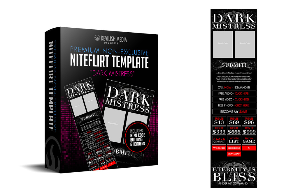 A dark, gothic, financial domination themed NiteFlirt template including HTML code, images, buttons, and matching 1500 x 500 header graphics for use on social media profile pages. It is a non exclusive, complete template with no customization options and so it is available for immediate download as a zip file.
